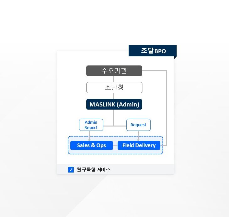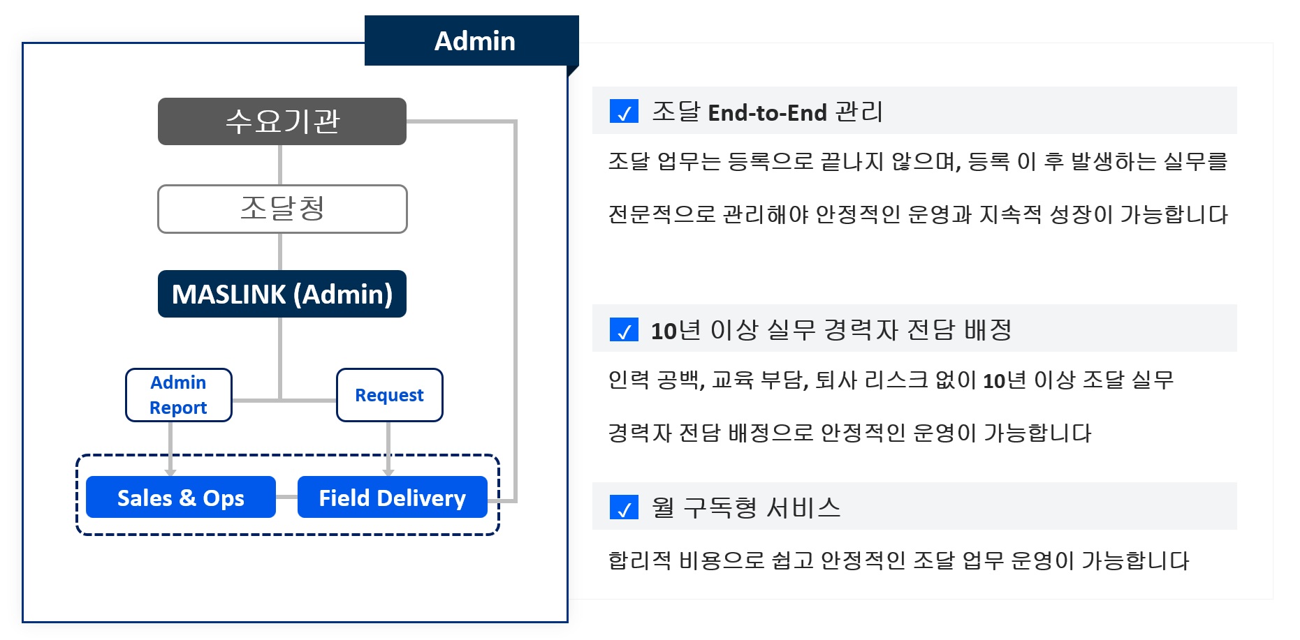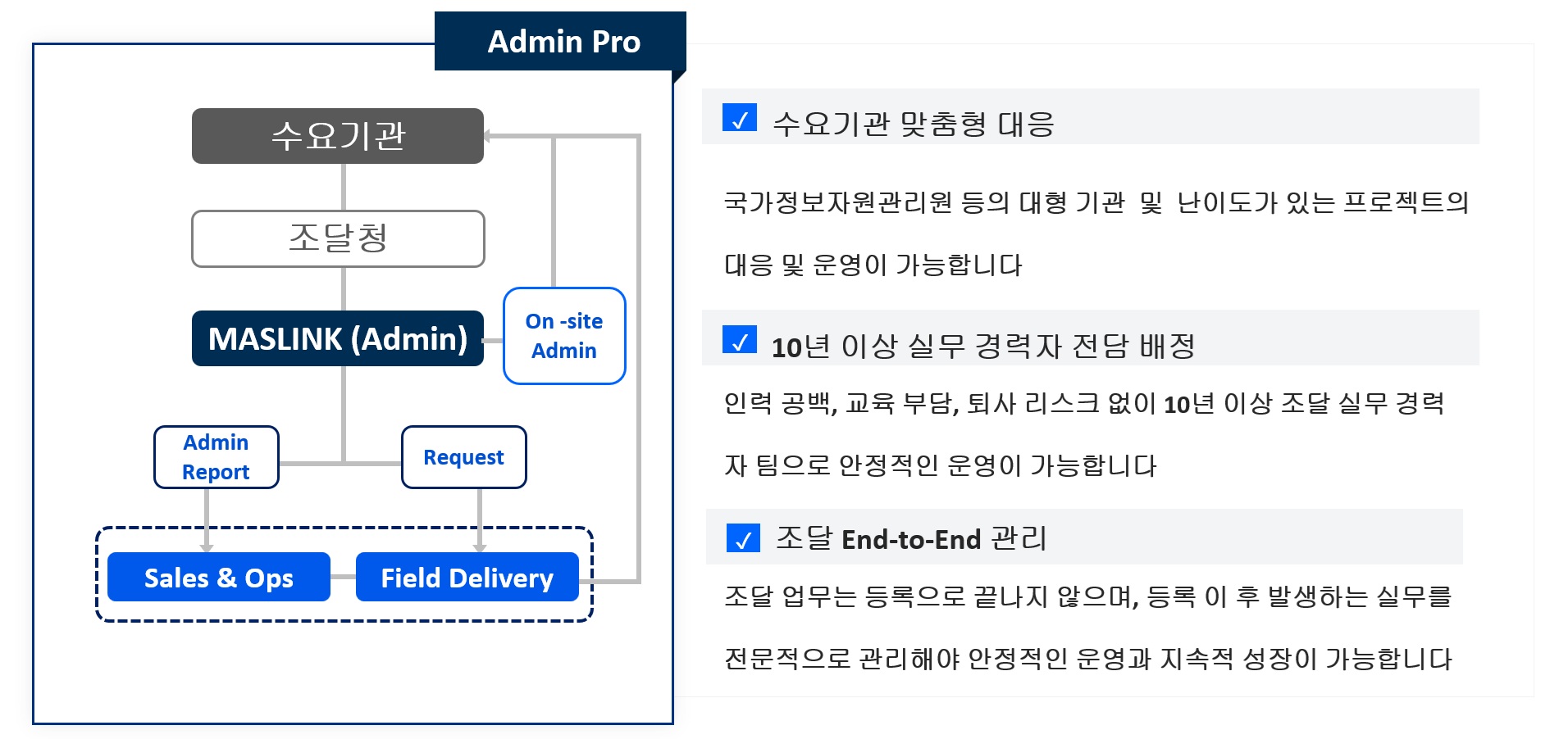 서비스 소개 조달BPO Service 조달 실무 외주 관리 (조달 BPO, Business Process Outsourcing) Basic Service MASLINK Admin Admin 서비스는 조달 등록부터 납품 운영 및 종결 관리까지 End-to-End로 제공되는 월 구독형 조달 BPO 서비스입니다. 패키지 SW 등 표준화된 납품 프로세스 적용이 가능한 품목을 대상으로 제공합니다. MASLINK가 조달 실무를 전담 수행하고, 고객사는 의사결정과 핵심 비즈니스에 인적 자원 및 역량을 집중할 수 있습니다. Plus Service MASLINK Admin Pro Admin Pro 서비스는 수요기관의 납품 건마다 발생하는 요구사항을 체계적으로 지원하는 납품 단위 별 조달 BPO 서비스입니다. 발주기관별, 납품 단위별 관리 난이도와 요청사항에 따라 서비스 운영 조건을 합리적으로 제안드리며, 소규모 기관부터 대형 프로젝트까지 안정적으로 대응 가능합니다. MASLINK가 조달 실무를 전담 수행하고, 고객사는 의사결정과 핵심 비즈니스에 인적 자원과 역량을 집중할 수 있습니다.